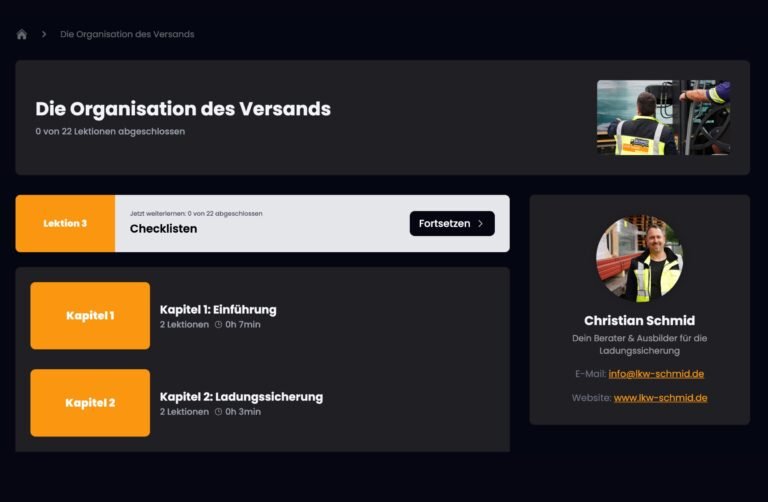 Nach Zahlungseingang erhältst du innerhalb von 24–48 Stunden eine Mail von unserer Lernplattform. Darüber erstellst du dein Passwort und erhältst direkten Zugriff auf dein Dashboard und das Online-Seminar. Für Mehrfachbuchungen sende bitte Namen und E-Mail-Adressen aller Teilnehmenden an bestellungen@lkw-schmid.de, damit wir individuelle Zugänge anlegen können.