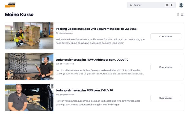 Hier findest du alle Kurse kompakt und übersichtlich, ideal, um das passende Weiterbildungsangebot für deinen Bedarf zu finden. Von der Verpackung und Ladeeinheiten-Sicherung nach VDI 3968, über die Ladungssicherung im PKW, bis hin zum Containerversand nach CTU-Code.